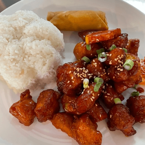 Crispy chicken pieces, coated with a sweet and tangy orange sauce, offering a delightful balance of flavors and textures.