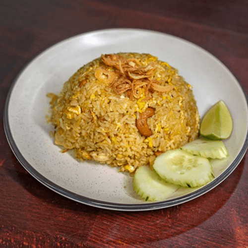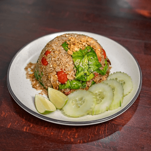 Stir-fried with Egg, Yellow Curry Powder, Onions, Celery, Bell Peppers, Scallions, and topped with Thai Chili Jam