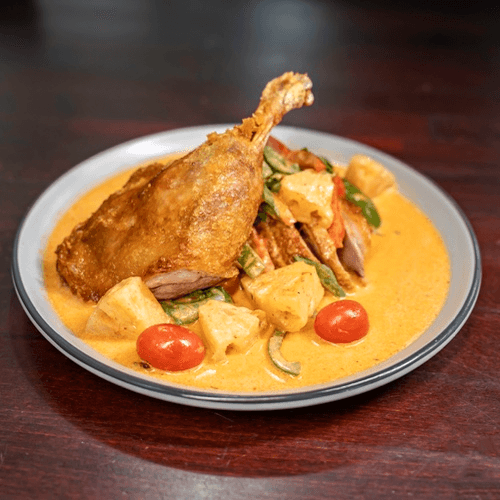 Slow-roasted half duck simmered in a rich, fragrant Thai red curry with creamy coconut milk, fresh Thai basil, cherry tomatoes, and sweet pineapple. This dish offers a perfect balance of spicy, savory, and fruity notes — a comforting yet refined flavor inspired by royal Thai cuisine. Served with jasmine rice.