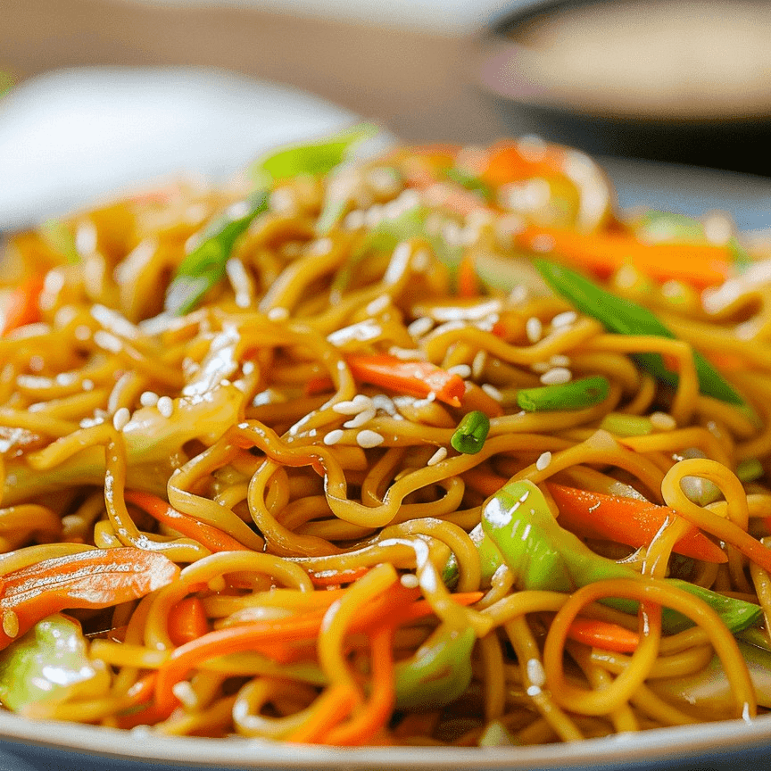 Delicate glass noodles stir-fried with a medley of fresh vegetables, all tossed in a savory soy sauce for a delightful balance of flavors and textures.