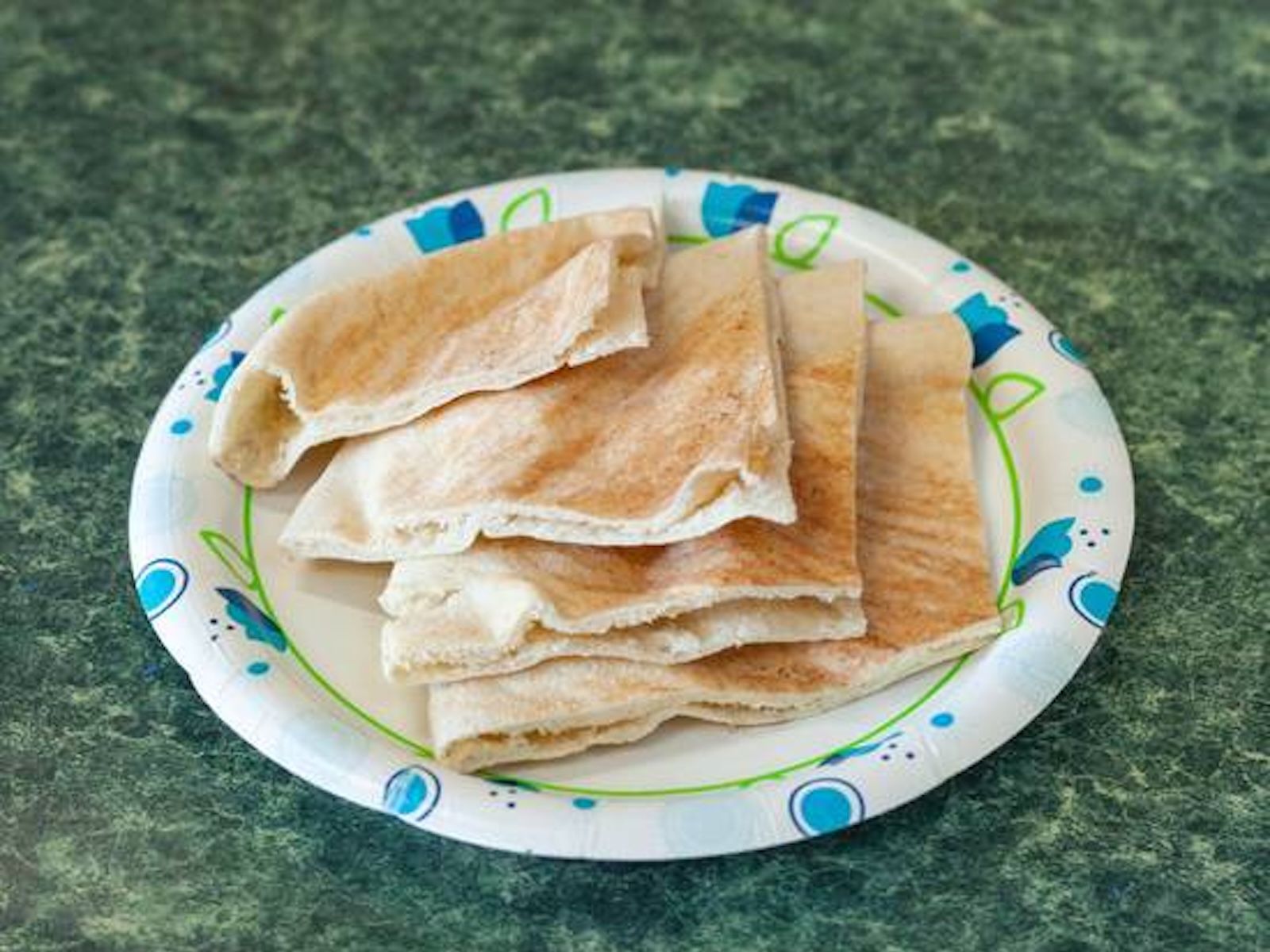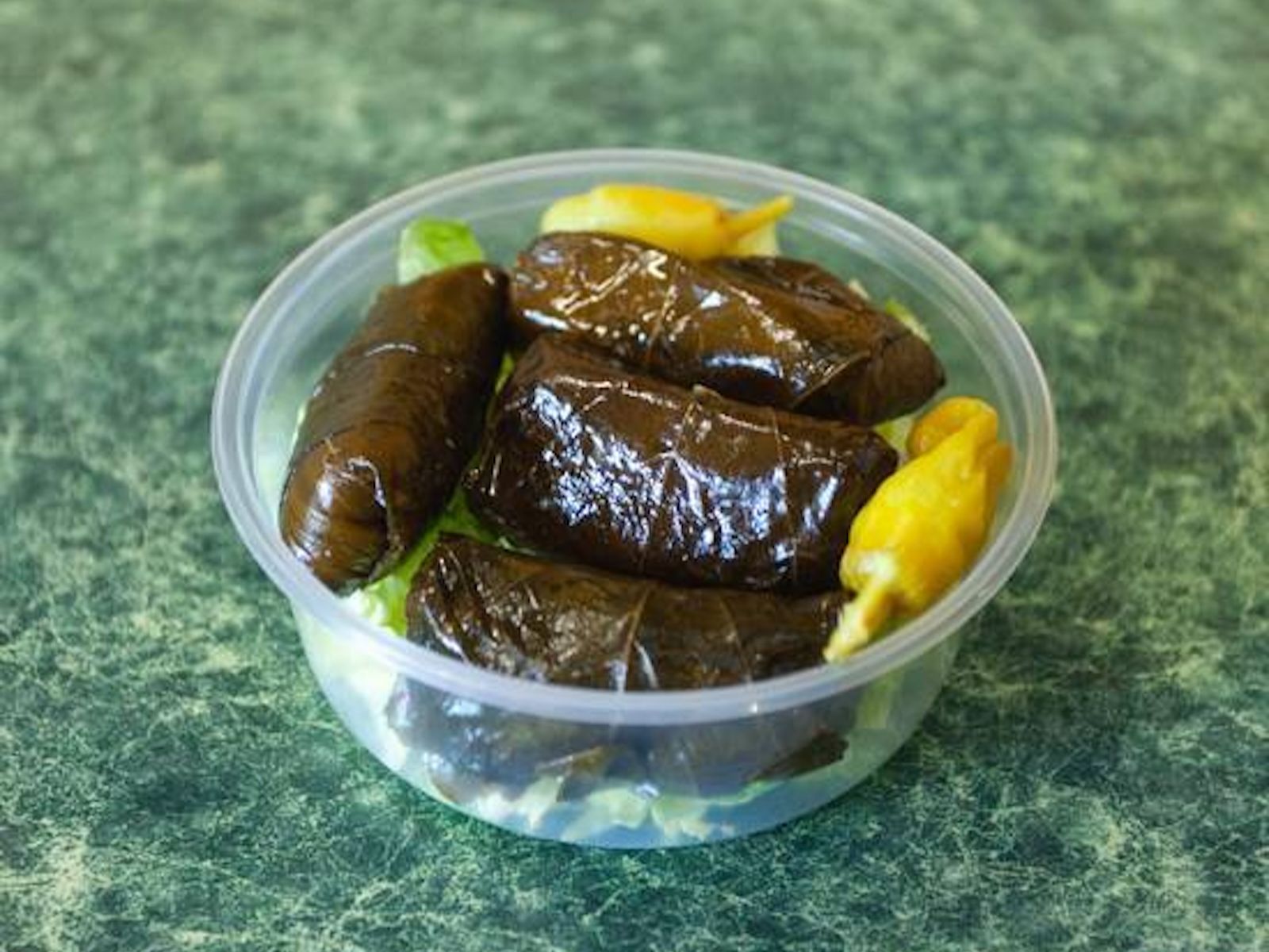 Stuffed grape leaves served with tabbouleh salad, hummus, and warm pita bread.