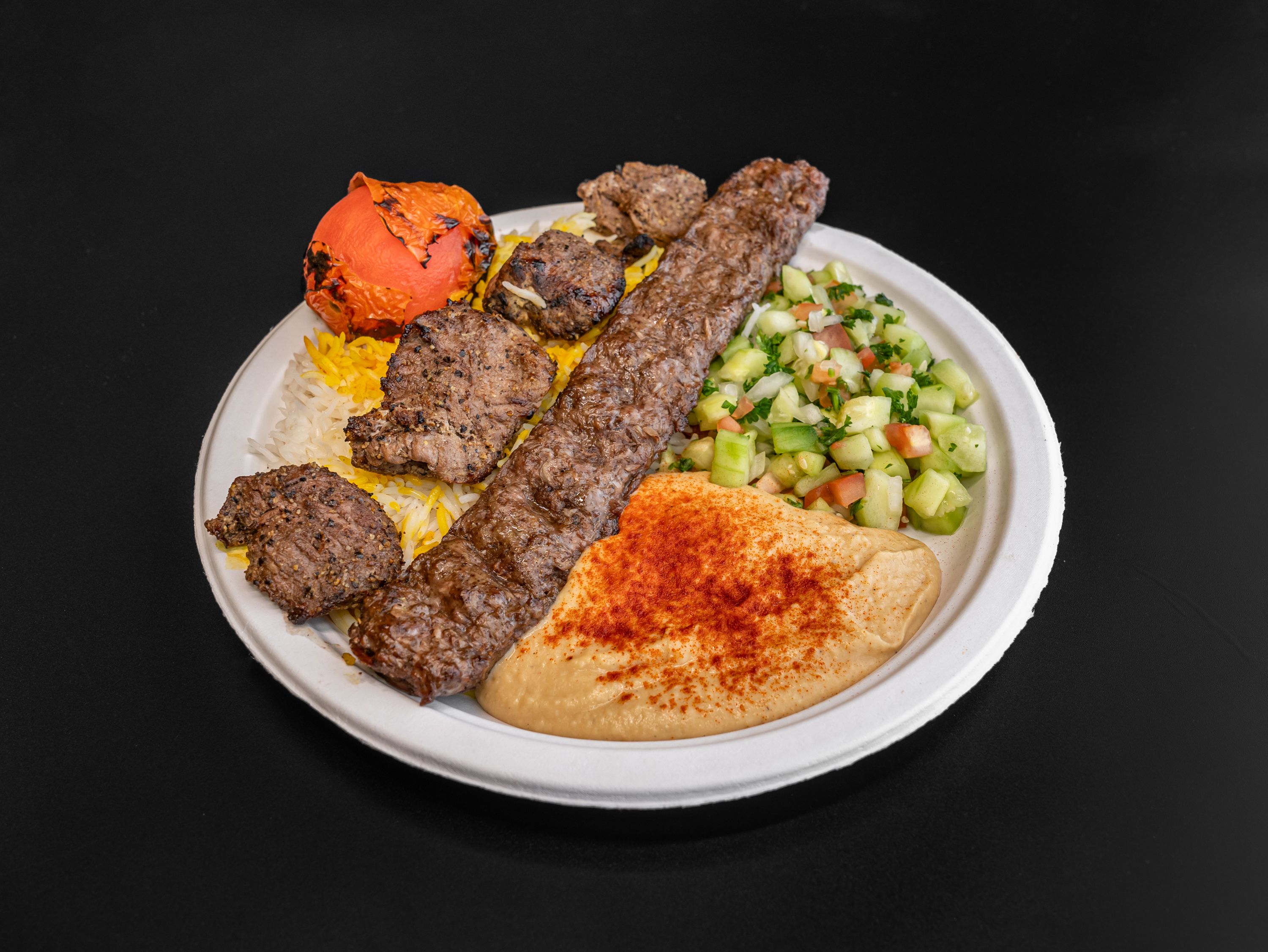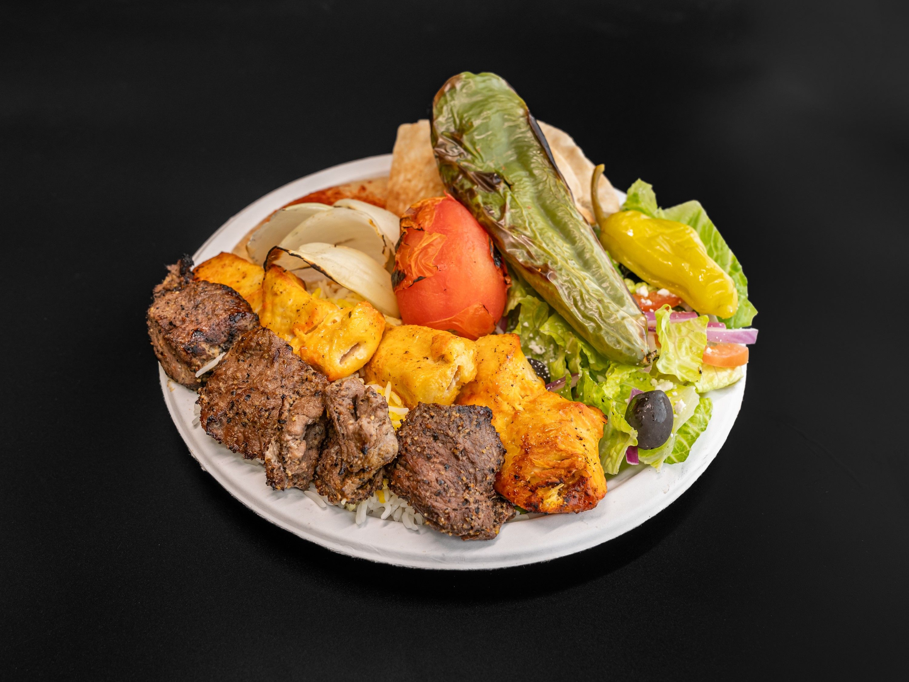 Get the best of both worlds with juicy grilled beef and chicken kabobs, served up with fluffy rice and warm pita. Each plate comes with a grilled tomato, sweet Anaheim pepper, and smoky onions. Pick any two sides to round out your meal just the way you like it.