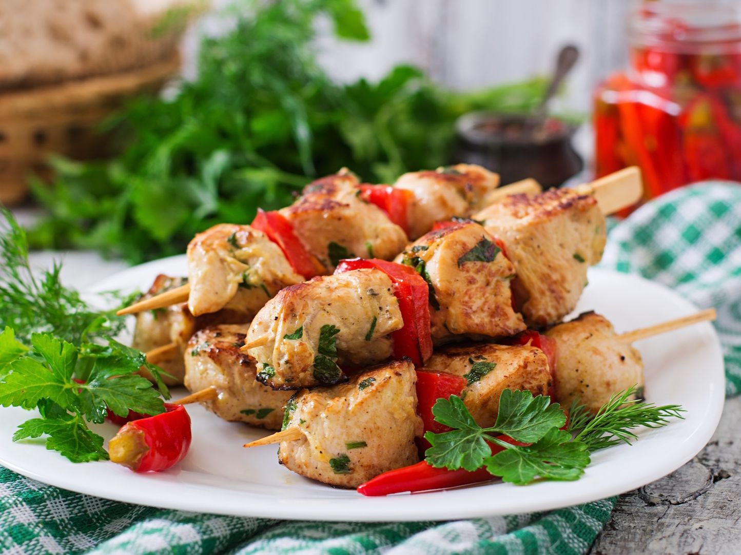 Two skewers—choose beef, chicken, or a mix of both—served with rice, warm pita bread, and two sides of your choice.